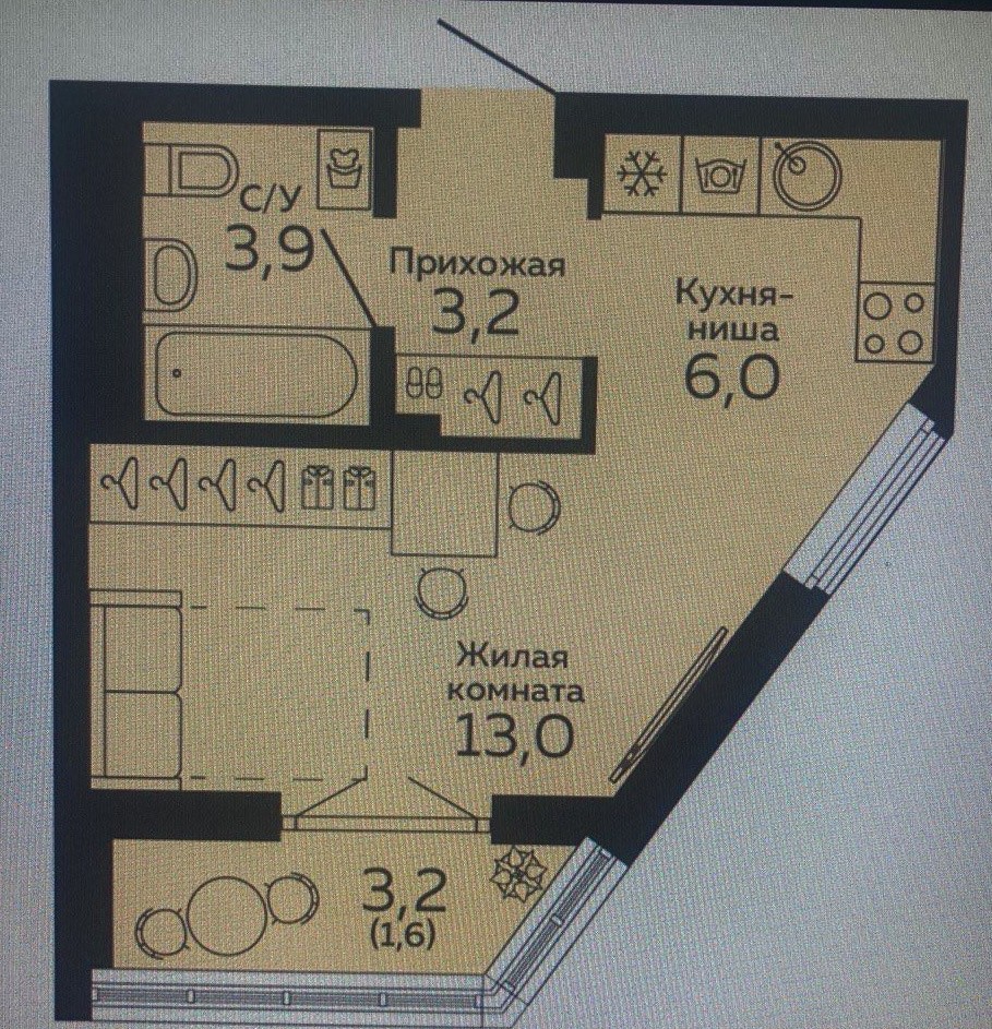 Общая площадь: 43.6м2